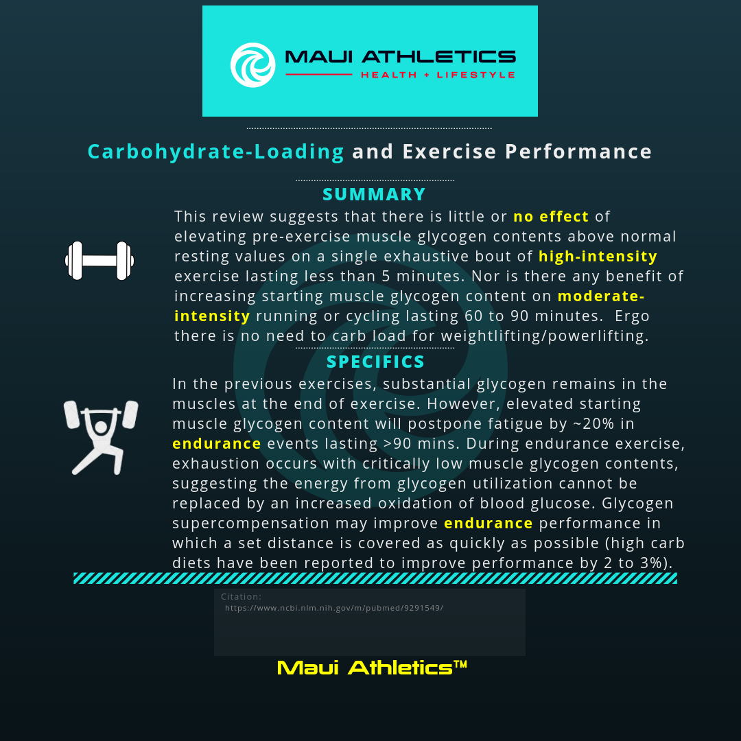 Carbohydrate loading has been shown to be inconsequential in short burst-high intensity exercise as well as moderate intensity exercise lasting 60-90 minutes.