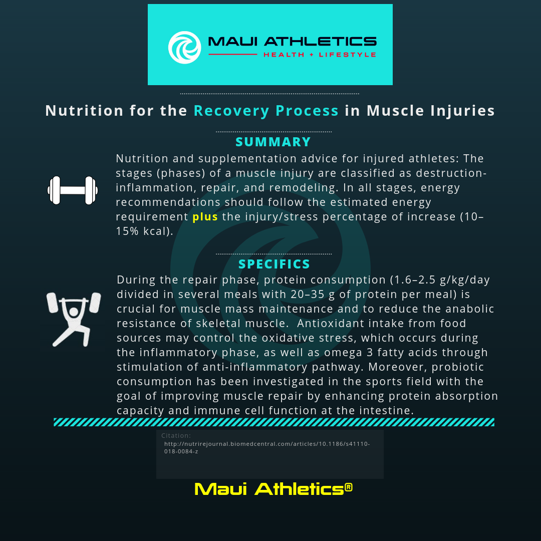 Nutrition and supplementation advice for injured athletes: The stages (phases) of a muscle injury are classified as destruction-inflammation, repair, and remodeling. In...