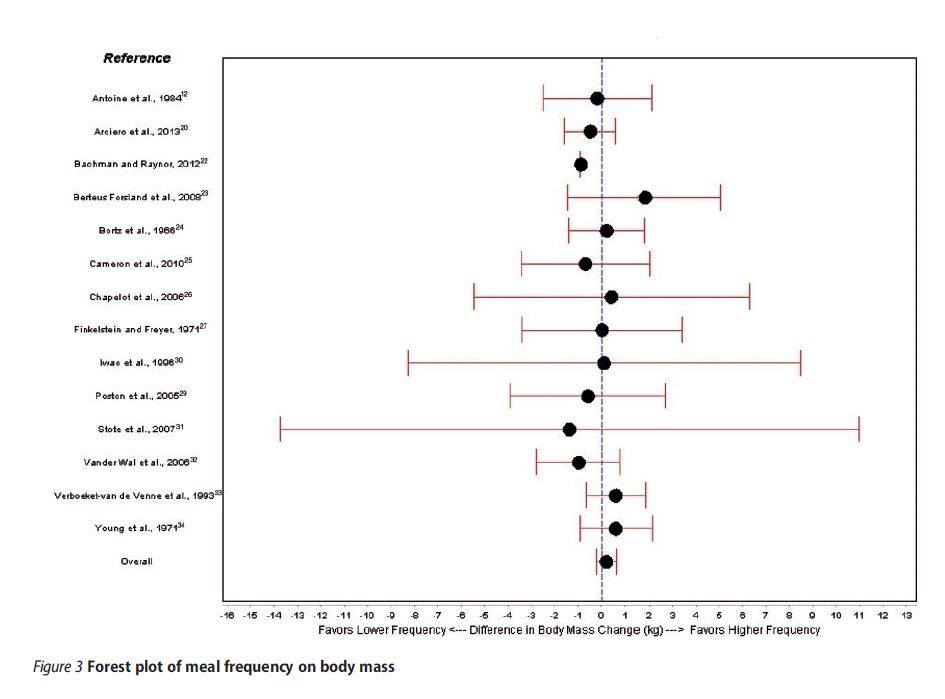 Despite what is often claimed, consuming small, frequent meals doesn’t “stoke your metabolism” to enhance weight loss. Pictured above is a forest plot of the meta-analysis from Schoenfeld et al 2015 – note that the solid circles reside almost equally on either side of the ‘zero line’ that separates greater vs lesser meal frequencies. This indicates similar weight loss regardless of how often you eat (provided calories are equated). On the other hand, a case can be made that a minimum of 3-4 daily meals are needed to maximize muscle building since the anabolic effects of a protein-rich meal last approximately 5 hours.