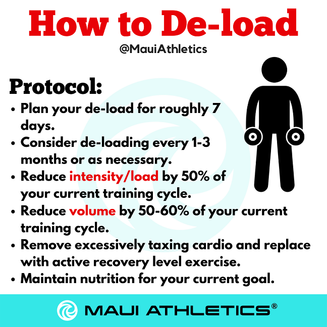 • De-load: a training de-load is a period where you lift less weight or reduce your training volume to allow for marked improvements to your accumulated physical and mental fatigue. If none of the previous options have worked, or if you feel fatigue is extremely significant, a break from your regular routine can let you recharge. The need for a de-load also gives you some hints that training practices may need to be evaluated. De-loads do not necessarily mean being sedentary, but can if you so choose (for a planned period of time). I will go over how to properly perform a training de-load in the next section. A similar tactic can be employed for nutrition if you find yourself rebelling against your standard fare; how about a structured nutrition break? Take a 1 to 2 week break from your diet to prevent burnout and to refuel your passion. This doesn’t mean go off the rails, but instead of a regimented routine be more flexible, don’t track, and eat with moderation in mind. Push lean protein, and fruits and veggies at each meal, but otherwise don’t worry about it…and there is always room for a little cake on the side.