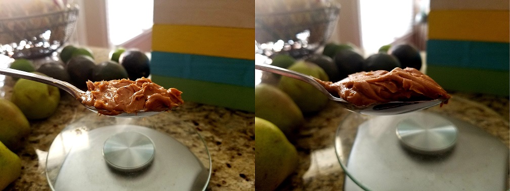 The spoon on the left contains one serving by weight. The spoon on the right contains two full servings, which ends up being an extra ~200 calories in a single go. By the end of the day, this type of discrepancy can add up to a diet that consists of over 1000 calories more than intended.