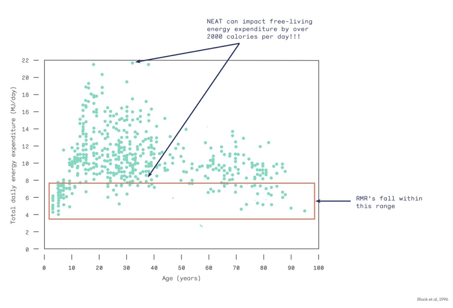 NEAT plays a critical role in weight management. NEAT levels are a measure of all activities you perform throughout the day that are not directly part of your exercise routine. This includes fidgeting, walking, dancing a jig, out-running venomous animals if you are Australian, picking up your child, etc. NEAT levels are also the main reason people tend to clump themselves into the categories of “fast” or “slow” metabolism. These designations have less to do with your metabolism, and more to do with the energy you expend in your daily life. Those with desk jobs are especially at risk for having low NEAT levels. NEAT variance can account for an over 2000 calories per day difference in energy expenditure!
